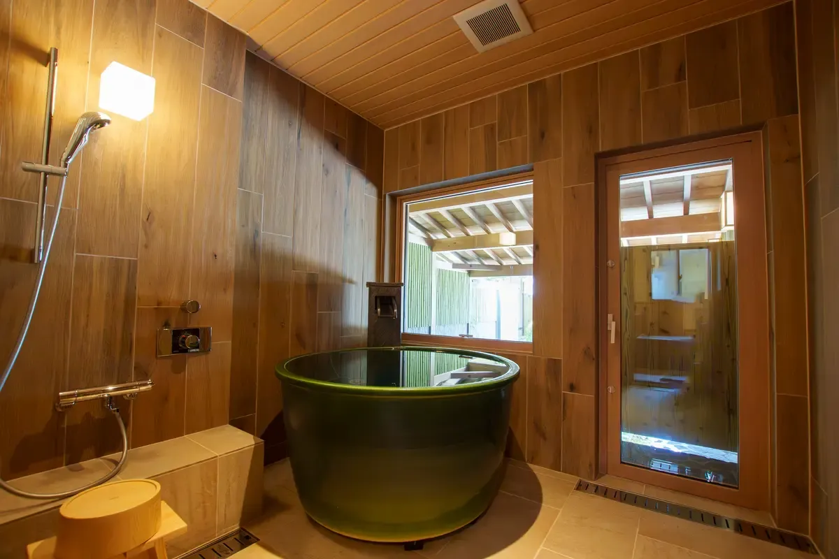 沿着专用通道,静静伫立着三栋别墅式客房。约 20 榻榻米(约 33 平方米)的客厅与卧室可利用拉门隔开,可供 2 ~4 位宾客宽敞舒适地入住。客房内备有信乐烧的室内浴池,以及源泉挂流式的露天温泉。此外,您亦可在大浴场「洗心之汤」享受天然温泉。客房内还备有洗衣机和私家日式庭园,推荐给长期入住或家庭旅客。