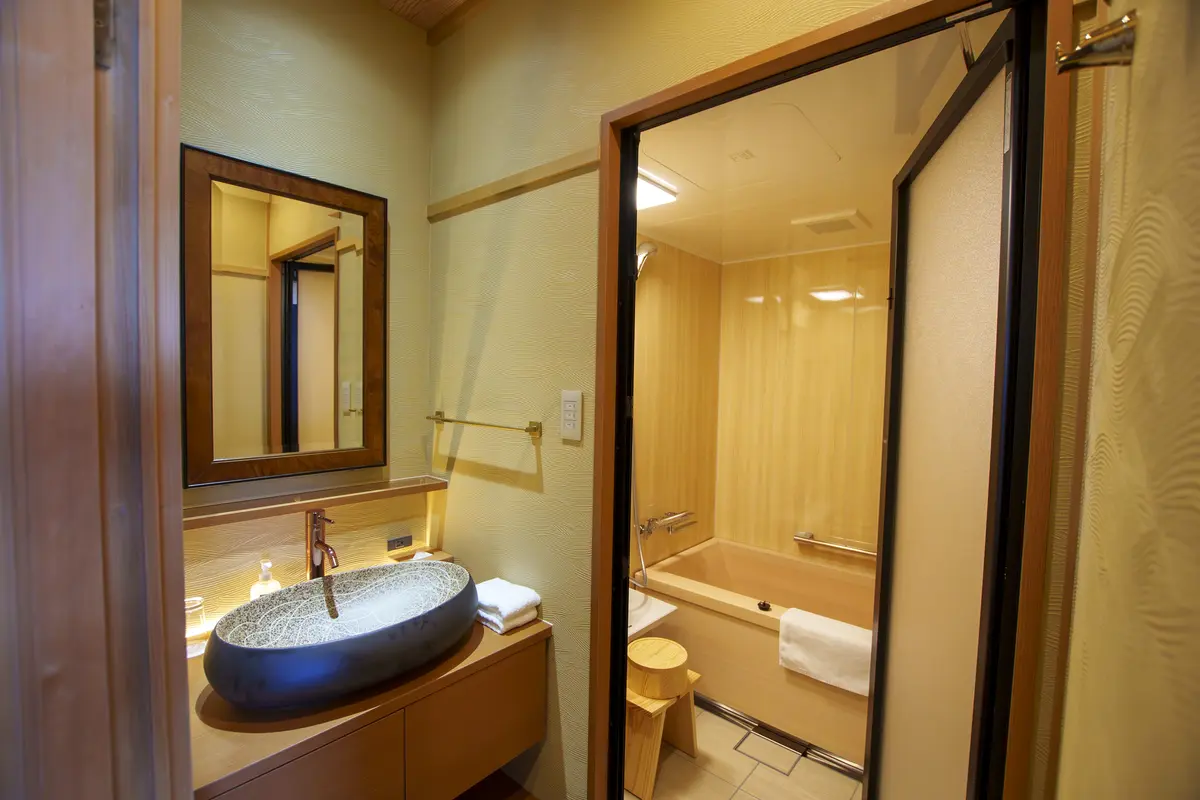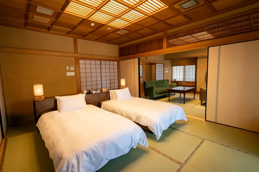 宽敞开放的空间,让您独享顶楼的极致景观。客房内的桧木浴池也能远眺濑户内海,眼前尽是获选为「日本百景」的绝美景致。可额外加床,最多可容纳三位宾客。与泉水源头自由流动的大浴池 「洗心之汤」一起,享受调和身心的住宿体验。